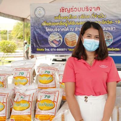 6. พล.ต.ต.สุรินทร์ ปาลาเร่ สส.พรรคประชาธิปัตย์ สงขลา เขต 8 และ คุณปรินดา ปาลาเร่ เลขานุการนายก อบจ.สงขลา มอบข้าวสารถุงละ 5 กิโลกรัม จำนวน 100 ถุง