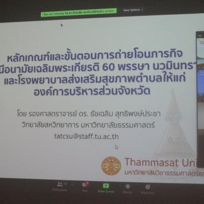 วันที่ 12 ตุลาคม 2564 นายไพเจน มากสุวรรณ์ นายกองค์การบริหารส่วนจังหวัดสงขลา พร้อมด้วยนางปิยนันท์ สิงห์ทอง รองปลัดองค์การบริหารส่วนจังหวัดสงขลา หัวหน้าส่วนราชการ และเจ้าหน้าที่ที่เกี่ยวข้อง ร่วมการสัมมนาแนวทางการดำเนินการถ่ายโอนภารกิจสถานีอนามัยเฉลิมพระเกียรติ 60 พรรษา นวมินทราชินี และโรงพยาบาลส่งเสริมสุขภาพตำบลให้แก่องค์การบริหารส่วนจังหวัด ผ่านสื่ออิเล็กทรอนิกส์ด้วยระบบ Zoom Meeting ณ ห้องประชุม ชั้น 4 องค์การบริหารส่วนจังหวัดสงขลา