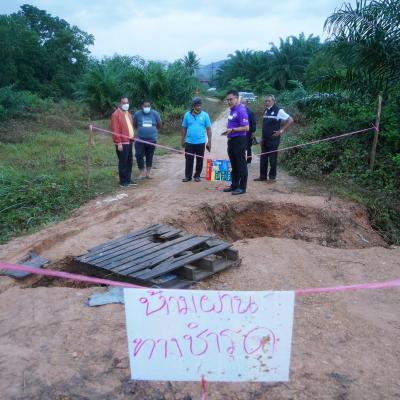 จุดที่(3)ถนนสายบ้านกลาง หมู่ที่ 3 ตำบลฉลุง เกิดน้ำกัดเซาะเป็นโพรงไม่สามารถสัญจรได้ นายก อบจ.สงขลา เร่งสั่งการให้เจ้าหน้าที่สำนักช่าง เร่งดำเนินการซ่อมเเซมเบื้องต้นเพื่อให้ประชาชนสามารถเดินทางสัญจรได้ เเละจัดทำแผนปรับปรุงในระยะยาวต่อไป