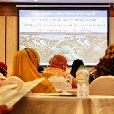 นางสาวภพภร ทองคณารักษ์ ผู้อำนวยการกองผังเมือง เข้าร่วมประชุมรับฟังความคิดเห็นของประชาชนและผู้มีส่วนได้เสีย โครงการกำจัดขยะมูลฝอยองค์การบริหารส่วนจังหวัดสงขลา โดยแปรรูปเป็นพลังงานไฟฟ้า ของบริษัททีพีไอ โพลีน เพาเวอร์ จำกัด (มหาชน)