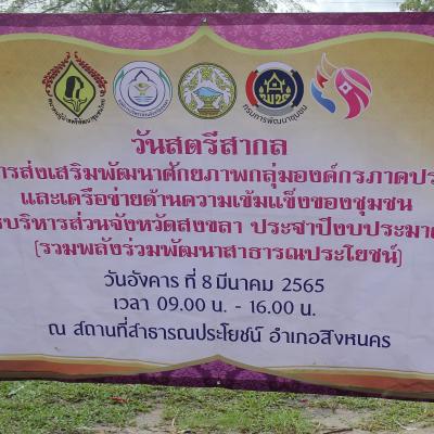 วันที่ 8 มีนาคม 2565 เวลา 09.00 น. นายไพเจน มากสุวรรณ์ นายกองค์การบริหารส่วนจังหวัดสงขลา เป็นประธานเปิดกิจกรรมเนื่องในวันสตรีสากล โครงการส่งเสริมพัฒนาศักยภาพกลุ่มองค์กรภาคประชาชน และเครือข่ายด้านความเข้มแข็งของชุมชน องค์การบริหารส่วนจังหวัดสงขลา ประจำปีงบประมาณ 2565 (รวมพลังร่วมพัฒนาสาธารณประโยชน์) พร้อมด้วย