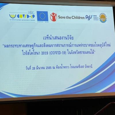 วันที่ 28 มีนาคม 2565 นางสาวปรินดา ปาลาเร่ รองนายกองค์การบริหารส่วนจังหวัดสงขลา ร่วมรับฟังการนำเสนอผลการวิจัย “ผลกระทบทางเศรษฐกิจและสังคม จากสถานการณ์การแพร่ระบาดของโรคอุบัติใหม่ไวรัสโคโรน่า 2019 (COVID-19) ในจังหวัดชายแดนใต้” จัดโดยคณะพยาบาลศาสตร์ มหาวิทยาลัยสงขลานครินทร์ วิทยาเขตปัตตานี ณ ห้องประชุมน้ำพราว โรงแรมซีเอส ปัตตานี อ.เมือง จ.ปัตตานี