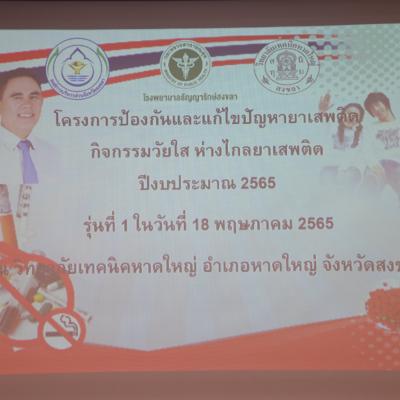 กิจกรรมวัยใส ห่างไกลยาเสพติด เป็นการบูรณาการความร่วมมือในการป้องกันและแก้ไขปัญหายาเสพติด ซึ่งองค์การบริหารส่วนจังหวัดสงขลา ร่วมกับโรงพยาบาลธัญญารักษ์สงขลา วิทยาลัยเทคนิคหาดใหญ่ และภาคีเครือข่ายด้านยาเสพติด จังหวัดสงขลา โดยมีกลุ่มเป้าหมายเป็นเยาวชน นักเรียนนักศึกษา ครู อาจารย์ จากสถานศึกษาในพื้นที่จังหวัดสงขลา และเจ้าหน้าที่ที่เกี่ยวข้อง (รุ่นที่ 1 จำนวน 150 ท่าน) เพื่อให้เยาวชนมีความรู้ ความเข้าใจ ตระหนักถึงภัยของยาเสพติด มีทักษะและวิธีปฏิบัติตน ให้ห่างไกลยาเสพติด และเพื่อพัฒนาทักษะความคิด สร้างภูมิคุ้มกันทางด้านร่างกาย จิตใจให้กับเยาวชนไม่ตกเป็นทาสของยาเสพติด อีกทั้งเพื่อเป็นการสร้างแกนนำเยาวชน ด้านการป้องกันและแก้ไขปัญหายาเสพติดในสถานศึกษาและชุมชน