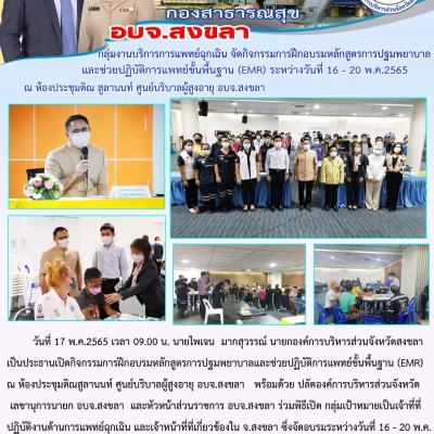 กลุ่มงานบริการการแพทย์ฉุกเฉิน จัดกิจกรรมการฝึกอบรมหลักสูตรการปฐมพยาบาลและช่วยปฏิบัติการขั้นพื้นฐาน (EMR) ระหว่างวันที่ 16 - 20 พ.ค.2565 ณ ห้องประชุมติณสูลานนท์ ศูนย์บริบาลผู้สูงอายุ อบจ.สงขลา