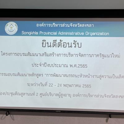 การอบรมสัมมนาฯ มีวัตถุประสงค์เพื่อสร้างความรู้ ความเข้าใจในบทบาทและความสำคัญของการบริหารงานที่มีประสิทธิภาพ ภายใต้หลักพื้นฐานของการบริหารจัดการภาครัฐแนวใหม่ ตลอดจนการปรับพื้นฐานกระบวนการทำงานเพื่อให้เกิดประโยชน์สูงสุดแก่ประชาชน // โดยมีหัวหน้าส่วนราชการ หัวหน้าฝ่าย หัวหน้างานและเจ้าหน้าที่ ที่ปฏิบัติหน้าที่เกี่ยวข้องกับงานธุรการ เข้ารับการอบรม // จัดขึ้นในระหว่างวันที่ 22 - 24 พฤษภาคม 2565 ณ ห้องประชุมติณสูลานนท์ ศูนย์บริบาลผู้สูงอายุ องค์การบริหารส่วนจังหวัดสงขลา