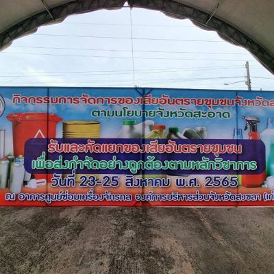 กิจกรรมในครั้งนี้ เป็นการรับและคัดแยกของเสียอันตรายในพื้นที่จังหวัดสงขลา (ระหว่างวันที่ 23-25 สิงหาคม 2565) และขนย้ายขยะเพื่อส่งทำลาย ณ สถานที่กำจัดขยะอันตรายที่ถูกต้องตามหลักวิชาการ (วันที่ 26 สิงหาคม 2565) เพื่อเพิ่มประสิทธิภาพการบริหารจัดการของเสียอันตรายจากชุมชนให้แก่องค์กรปกครองส่วนท้องถิ่น อีกทั้งเป็นการรักษาสิ่งแวดล้อมที่ดีในชุมชน และลดผลกระทบต่อสุขภาพอนามัยของประชาชนที่เกิดจากของเสียอันตรายจากชุมชน