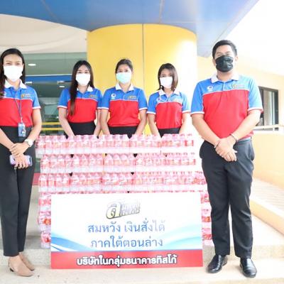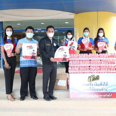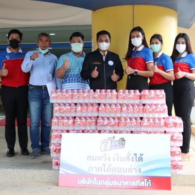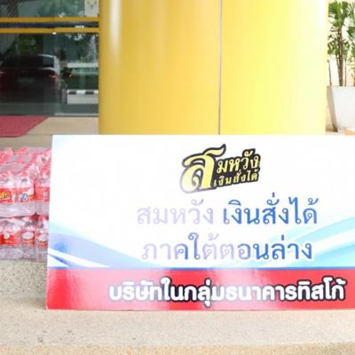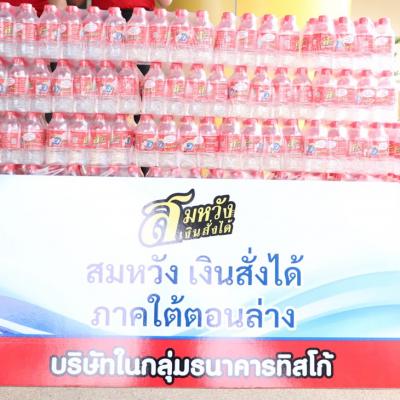 นายชัยวุฒิ ผ่องแผ้ว รองนายกองค์การบริหารส่วนจังหวัดสงขลา รับมอบน้ำดื่มจาก "สมหวัง เงินสั่งได้" โดยบริษัท ไฮเวย์ จำกัด บริษัทในกลุ่มธนาคารทิสโก้