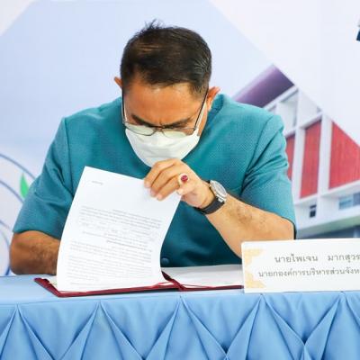 นายกอบจ.สงขลา เป็นประธานในพิธีเปิดพิธีลงนามบันทึกข้อตกลงความร่วมมือการ จิตบริการสาธารณะขององค์กรปกครองส่วนท้องถิ่น เรื่อง การบริหารจัดการธนาคารสร้างสุขชุมชน ยืม คืน เตียงฝึกยืนไฟฟ้าสำหรับเด็ก