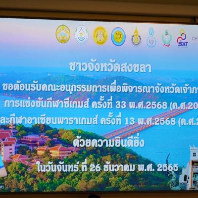 โดยมี นายเจษฎา จิตรัตน์ ผู้ว่าราชการจังหวัดสงขลา กล่าวต้อนรับคณะอนุกรรมการฯ พร้อมทั้งนำเสนอความพร้อมการเสนอตัวเป็นเจ้าภาพการแข่งขันกีฬาซีเกมส์ ครั้งที่ 33 และกีฬาอาเซียนพาราเกมส์ ครั้งที่ 13 พ.ศ. 2568 ในแต่ละสนามการแข่งขันฯ