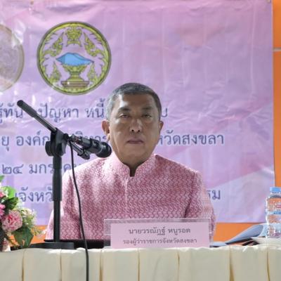 นายวิโรจน์ ทัฬหะวาสน์ ผู้เชี่ยวชาญพิเศษด้านการบริหารงานบุคคล องค์การบริหารส่วนจังหวัดสงขลา ร่วมเป็นเกียรติในพิธีเปิด และกล่าวต้อนรับ รองผู้ว่าราชการจังหวัดสงขลา และผู้เข้าร่วมโครงการ “รู้ทัน ปัญหา หนี้นอกระบบ” พร้อมด้วยนายปรีชัย มาละวรรณโณ ที่ปรึกษานายกองค์การบริหารส่วนจังหวัดสงขลา ร่วมเป็นเกียรติในพิธีเปิด