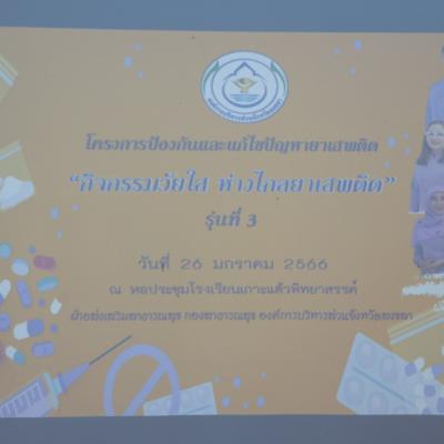 25 มกราคม 2566 เวลา 09.00 น. นายไพเจน มากสุวรรณ์ นายกองค์การบริหารส่วนจังหวัดสงขลา เป็นประธานกล่าวเปิดโครงการป้องกันและแก้ไขปัญหายาเสพติด " กิจกรรม วัยใส ห่างไกลยาเสพติด รุ่นที่ 3 " ณ อาคารอเนกประสงค์ โรงเรียนเกาะแต้วพิทยาสรรค์ อ.เมืองสงขลา จ.สงขลา