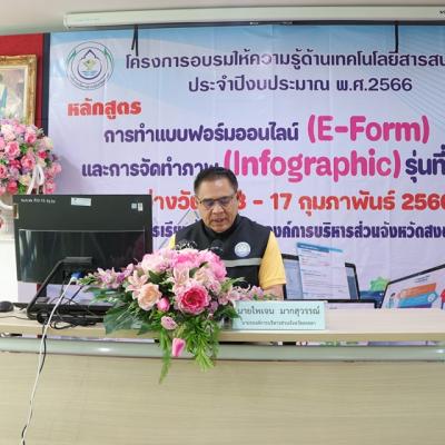 โครงการอบรมให้ความรู้ด้านเทคโนโลยีสารสนเทศ ประจำปีงบประมาณ พ.ศ. 2566 หลักสูตร การทำแบบฟอร์มออนไลน์ (E-Form) และการจัดทำภาพ (Infographic) รุ่นที่ 1 จัดขึ้น โดยมีกลุ่มเป้าหมายได้แก่ เด็ก เยาวชน และประชาชนทั่วไปในจังหวัดสงขลา และมีวัตถุประสงค์ดังนี้