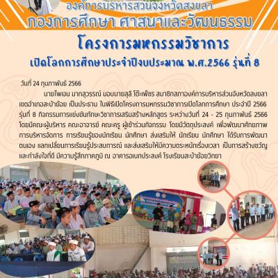 นายไพเจน มากสุวรรณ์ มอบนายสุลี โต๊ะเพ็ชร สมาชิกสภาองค์การบริหารส่วนจังหวัดสงขลา เขตอำเภอสะบ้าย้อย เป็นประธาน ในพิธีเปิดโครงการมหกรรมวิชาการเปิดโลกการศึกษา ประจำปีงบประมาณ พ.ศ. 2566 รุ่นที่ 8 กิจกรรมการแข่งขันทักษะวิชาการเสริมสร้างหลักสูตร ระหว่างวันที่ 24 - 25 กุมภาพันธ์ 2566 โดยมีคณะผู้บริหาร คณะอาจารย์ คณะครู ผู้เข้าร่วมกิจกรรม โดยมีวัตถุประสงค์ เพื่อพัฒนาศักยภาพ การบริหารจัดการ การเรียนรู้ของนักเรียน นักศึกษา ส่งเสริมให้ นักเรียน นักศึกษา ได้รับการพัฒนาตนเอง แลกเปลี่ยนการเรียนรู้ประสบการณ์ และส่งเสริมให้มีความตระหนักเรื่องเวลา เป็นการสร้างขวัญและกำลังใจที่ดี มีความรู้สึกภาคภูมิ ณ อาคารอเนกประสงค์ โรงเรียนสะบ้าย้อยวิทยา