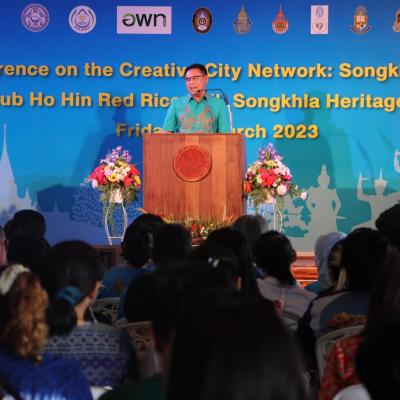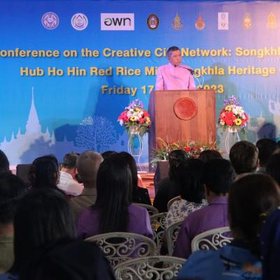 นายไพเจน มากสุวรรณ์ นายกองค์การบริหารส่วนจังหวัดสงขลา ร่วมบรรยายในหัวข้อเรื่อง "การขับเคลื่อนสงขลา สู่การเป็นเครือข่ายเมืองสร้างสรรค์ด้านอาหารของยูเนสโก"