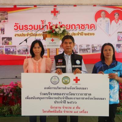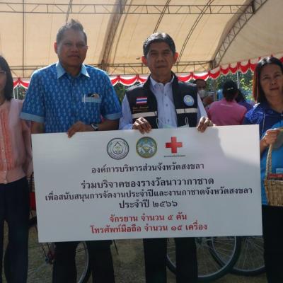 ในโอกาสนี้ องค์การบริหารส่วนจังหวัดสงขลา ได้มอบจักรยานจำนวน 5 คัน และโทรศัพท์มือถือ จำนวน 15 เครื่อง เพื่อใช้เป็นของรางวัลสำหรับร้านนาวากาชาด ในงานประจำปี และงานกาชาดจังหวัดสงขลา ประจำปี 2566