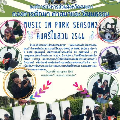 ด้วยองค์การบริหารส่วนจังหวัดสงขลา ร่วมกับภาคีเครือข่ายทางด้านดนตรี กำหนดจัดโครงการดนตรีในสวน (MUSIC IN PARK SEASON 2 )ประจำปี 2566 ทุกวันเสาร์ เริ่มการแสดงในวันเสาร์ที่ 25 กุมภาพันธ์ - 29 กรกฎาคม 2566 ตั้งแต่ เวลา 17.30 น. ถึง 19.30 น. โดยมีวัตถุประสงค์เพื่อให้เด็ก เยาวชน และประชาชนทั่วไปมีเวทีเพื่อการแสดงความสามารถทางด้านดนตรี เพื่อช่วยสร้างเครือข่ายด้านดนตรีการแสดงดนตรีอาชีพ และเพื่อเป็นการนันทนาการแก่เยาวชนประชาชนที่มาใช้บริการ ณ สวนสาธารณะบเมืองสงขลา จ.สงขลา