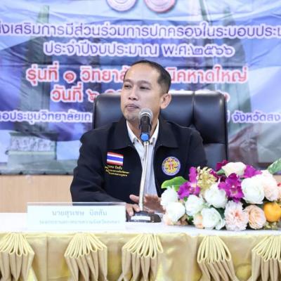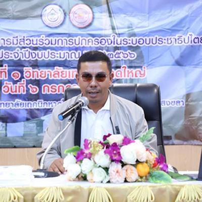 นายไพเจน มากสุวรรณ์ นายกองค์การบริหารส่วนจังหวัดสงขลา เป็นประธานในพิธีเปิด โครงการส่งเสริมการมีส่วนร่วมการปกครองในระบอบประชาธิปไตย ประจำปีงบประมาณ พ.ศ.2566 (รุ่นที่ 1) พร้อมด้วยนายทวีศักดิ์ อรัญดร รองประธานสภา อบจ.สงขลา นายมนัสฌาณ์ ชูเชิด ผู้อำนวยการวิทยาลัยเทคนิคหาดใหญ่ คณะอาจารย์ และประธานชุมชน คณะกรรมการชุมชน เขต 1 เทศบาลนครหาดใหญ่ ร่วมเป็นเกียรติในพิธีเปิด
