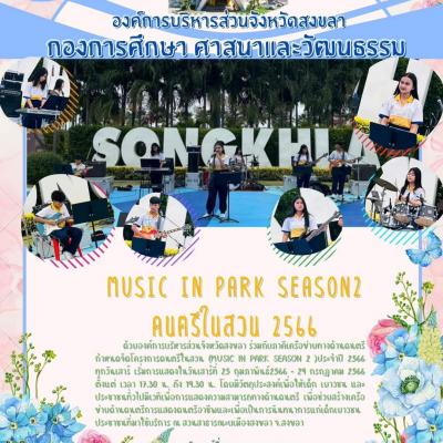 ด้วยองค์การบริหารส่วนจังหวัดสงขลา ร่วมกับภาคีเครือข่ายทางด้านดนตรี กำหนดจัดโครงการดนตรีในสวน (MUSIC IN PARK SEASON 2 )ประจำปี 2566 ทุกวันเสาร์ เริ่มการแสดงในวันเสาร์ที่ 25 กุมภาพันธ์2566 - 29 กรกฎาคม 2566 ตั้งแต่ เวลา 17.30 น. ถึง 19.30 น. โดยมีวัตถุประสงค์เพื่อให้เด็ก เยาวชน และประชาชนทั่วไปมีเวทีเพื่อการแสดงความสามารถทางด้านดนตรี เพื่อช่วยสร้างเครือข่ายด้านดนตรีการแสดงดนตรีอาชีพและเพื่อเป็นการนันทนาการแก่เด็กเยาวชนประชาชนที่มาใช้บริการ ณ สวนสาธารณะเมืองสงขลา จ.สงขลา