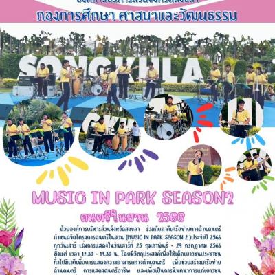 ด้วยองค์การบริหารส่วนจังหวัดสงขลา ร่วมกับภาคีเครือข่ายทางด้านดนตรี กำหนดจัดโครงการดนตรีในสวน (MUSIC IN PARK SEASON 2 )ประจำปี 2566 ทุกวันเสาร์ เริ่มการแสดงในวันเสาร์ที่ 25 กุมภาพันธ์ - 29 กรกฎาคม 2566 ตั้งแต่ เวลา 17.30 - 19.30 น. โดยมีวัตถุประสงค์เพื่อให้เด็กเยาวชนประชาชนทั่วไปมีเวทีเพื่อการแสดงความสามารถทางด้านดนตรี เพื่อช่วยสร้างเครือข่ายด้านดนตรี การแสดงดนตรีอาชีพ และเพื่อเป็นการนันทนาการแก่เยาวชนประชาชนที่มาใช้บริการ ณ สวนสาธารณะเมืองสงขลา จ.สงขลา