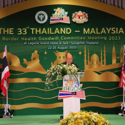 นายณัฐภัท ชุมทองเชิดบำรุง เลขานุการนายกองค์การบริหารส่วนจังหวัดสงขลา ร่วมให้การต้อนรับคณะแพทย์สาธารณสุขจากประเทศมาเลเซีย ในพิธีเปิดการประชุมความร่วมมือสาธารณสุขชายเเดนไทย - มาเลเซีย ครั้งที่ 33 (The 33rd Thailand - Malaysia Boder Health Goodwill Committee 2023