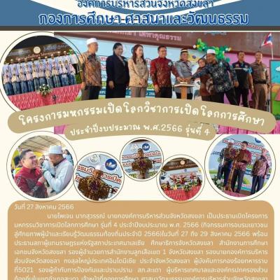 นายไพเจน มากสุวรรณ์ นายกองค์การบริหารส่วนจังหวัดสงขลา เป็นประธานเปิดโครงการมหกรรมวิชาการเปิดโลกการศึกษา รุ่นที่ 4 ประจำปีงบประมาณ พ.ศ. 2566 (กิจกรรมการอบรมเยาวชนสู่ศักยภาพผู้นำและเรียนรู้วัฒนธรรมท้องถิ่นประจำปี 2566)ในวันที่ 27 ถึง 29 สิงหาคม 2566 พร้อมประธานสภาผู้แทนราษฎรแห่งรัฐสภาประเทศมาเลเซีย ศึกษาธิการจังหวัดสงขลา สำนักงานการศึกษาเอกชนจังหวัดสงขลา รองผู้อำนวยการสำนักงานลูกเสือเขต 1 จังหวัดสงขลา รองนายกองค์การบริหารส่วนจังหวัดสงขลา กงสุลใหญ่ประเทศอินโดนีเซีย ประจำจังหวัดสงขลา ผู้บังคับการกองร้อยทหารราบที่5021 รองผู้กำกับการป้องกันและปราบปราม สภ.สะเดา ผู้บริหารเทศบาลและองค์กรปกครองส่วนท้องถิ่นในเขตอำเภอสะเดา เจ้าหน้าที่กองการศึกษา ศาสนาวัฒนธรรมองค์การบริหารส่วนจังหวัดสงขลา มีวัตถุประสงค์เพื่อการพัฒนาเพิ่มทักษะ องค์ความรู้ต่างๆ ให้เยาวชนนำไปสู่ความเป็นผู้กล้า สามารถสร้างสรรค์แสดงออก ยึดหลักคุณธรรมจริยธรรมในการดำเนินชีวิตคิดดีทำดี เอาความรู้มาประยุกต์ใช้ ช่วยสร้างสรรค์สังคมให้น่าอยู่โดยใช้ความรู้ที่ได้มาเป็นประโยชน์แก่ชุมชน แสดงออกถึงความรู้สึกนึกคิดในสถานการณ์ต่างๆ สามารถรู้เข้าใจ ยอมรับและใช้ปฏิบัติร่วมกันในสังคมไทย