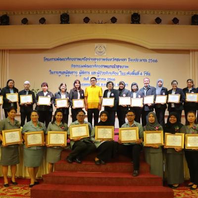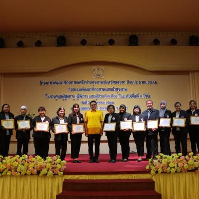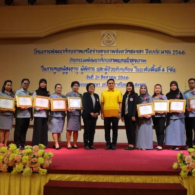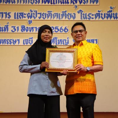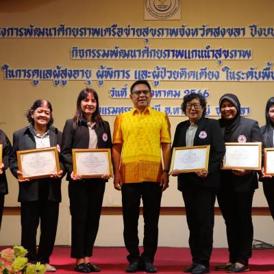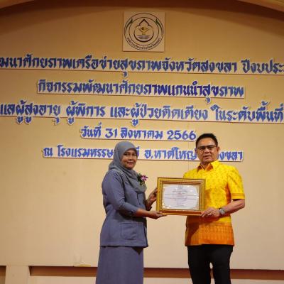 นายไพเจน มากสุวรรณ์ นายกองค์การบริหารส่วนจังหวัดสงขลา ให้เกียรติมอบประกาศเกียรติคุณ แก่อาสาสมัครสาธารณสุขดีเด่น ในโครงการพัฒนาศักยภาพเครือข่ายสุขภาพจังหวัดสงขลา ปี 2566 (กิจกรรมพัฒนาศักยภาพ แกนนำสุขภาพในการดูแลผู้สูงอายุ ผู้พิการ และผู้ป่วยติดเตียง ในระดับพื้นที่ 4 โซน)