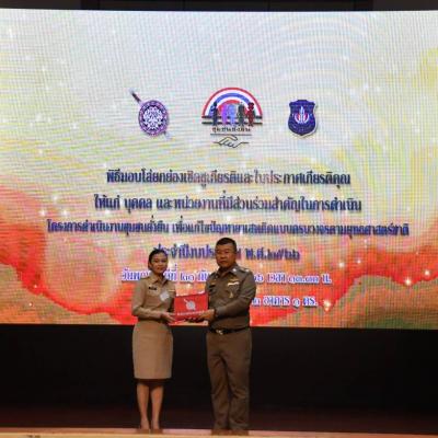 นายไพเจน มากสุวรรณ์ นายกองค์การบริหารส่วนจังหวัดสงขลา และนางสาวศมนฬธรรศ แสงแก้ว พยาบาลวิชาชีพชำนาญการ หัวหน้างานส่งเสริมสุขภาพ กองสาธารณสุข อบจ.สงขลา (ในฐานะผู้รับผิดชอบงานสุขภาพจิตและยาเสพติด) รับมอบโล่ยกย่องเชิดชูเกียรติ และใบประกาศเกียรติคุณ บุคคลและหน่วยงานที่มีผลการปฏิบัติดีเด่น "โครงการดำเนินงานชุมชนยั่งยืน เพื่อแก้ปัญหายาเสพติดแบบครบวงจรตามยุทธศาสตร์ชาติ ประจำปีงบประมาณ พ.ศ. 2566"