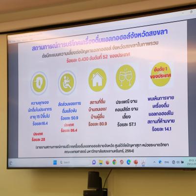 ทั้งนี้ ที่ประชุมได้สรุปสถานการณ์การบริโภคเครื่องดื่มแอลกอฮอล์จังหวัดสงขลา จากรายงานของศูนย์วิจัยปัญหาสุรา หน่วยระบาดวิทยา คณะแพทย์ศาสตร์ มหาวิทยาลัยสงขลานครินทร์ โดยในปี 2564 พบว่า จังหวัดสงขลา มีดัชนีคะแนนความเสี่ยงต่อปัญหาแอลกอฮอล์ในภาพรวม ร้อยละ 0.43 จัดอยู่ในอันดับที่ 52 ของประเทศ โดยความชุกของนักดื่มในประชากรอายุ 15 ปีขึ้นไป มีร้อยละ 16.4 สัดส่วนของการดื่มแล้วขับ ร้อยละ 50.9 สถานที่ดื่มบ้านตนเองบ้านผู้อื่นร้อยละ 80.9 ประเพณี งานคอนเสิร์ต งานเลี้ยง ร้อยละ 57.1 และพบเห็นการขายเครื่องดื่มแอลกอฮอล์ในสถานที่ห้ามจำหน่าย ร้อยละ 14.1 ซึ่งสูงสุดเป็นอันดับ 1 ของประเทศ
