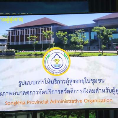 โดยในช่วง เวลา 10.30 น. นางสาวปรินดา ปาลาเร่ รองนายกองค์การบริหารส่วนจังหวัดสงขลา เป็นวิทยากร บรรยายในหัวข้อ “การส่งเสริมสุขภาพและคุณภาพชีวิตของผู้สูงอายุ” และนโยบายศูนย์สร้างสุขชุมชน ขององค์การบริหารส่วนจังหวัดสงขลา และการให้บริการของศูนย์บริบาลผู้สูงอายุ ในการส่งเสริมให้ผู้สูงอายุได้เข้ามาร่วมทำกิจกรรม เพื่อลดปัญหาผู้สูงอายุติดบ้าน ติดเตียง ลดปัญหาโรคซึมเศร้า ช่วยให้ผู้สูงอายุมีสุขภาพกาย และสุขภาพจิตที่ดียิ่งขึ้น มีอายุยืนยาวยิ่งขึ้น