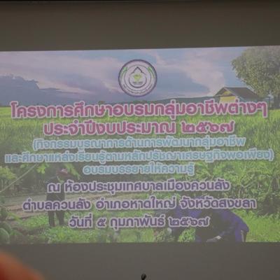 นายไพเจน มากสุวรรณ์ นายกองค์การบริหารส่วนจังหวัดสงขลา มอบหมายให้ นายจรัส ชุมปาน ผู้เชี่ยวชาญพิเศษด้านการพัฒนาสังคม เป็นประธานในพิธีเปิดโครงการศึกษาอบรมกลุ่มอาชีพต่างๆ ประจำปีงบประมาณ 2567 กิจกรรมศึกษาอบรมเเละพัฒนากลุ่มอาชีพ ภาคประชาชน ตามหลักปรัชญาเศรษฐกิจพอเพียง พร้อมด้วย นายร่อซี หนิมุสา รองนายกเทศมนตรีเมืองควนลัง ร่วมเป็นเกียรติในพิธีเปิด