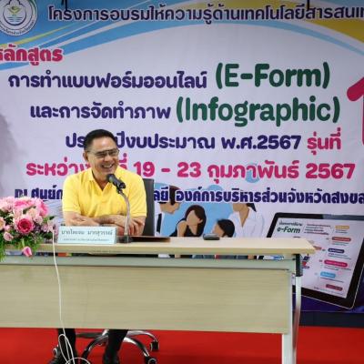 นายไพเจน มากสุวรรณ์ นายกองค์การบริหารส่วนจังหวัดสงขลา เป็นประธานในพิธีเปิด โครงการอบรมให้ความรู้ด้านเทคโนโลยีสารสนเทศ หลักสูตร : การทำแบบฟอร์มออนไลน์ (E-Form) และการจัดทำภาพ (Infographic) ประจำปีงบประมาณ พ.ศ. 2567 รุ่นที่ 1