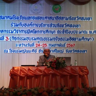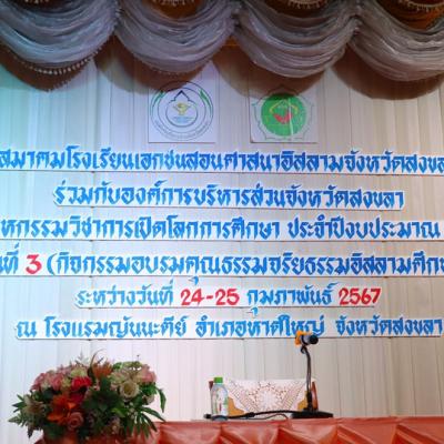 อบจ.สงขลา ร่วมกับ สมาคมโรงเรียนเอกชนสอนศาสนาอิสลาม จังหวัดสงขลา จัดโครงการมหกรรมวิชาการเปิดโลกการศึกษา ประจำปีงบประมาณ พ.ศ. 2567 รุ่นที่ 3 (กิจกรรมอบรมคุณธรรมจริยธรรมอิสลามศึกษา) มุ่งส่งเสริมการเป็นแบบอย่างที่ดีต่อสังคม และการอยู่ร่วมกันอย่างมีความสุข