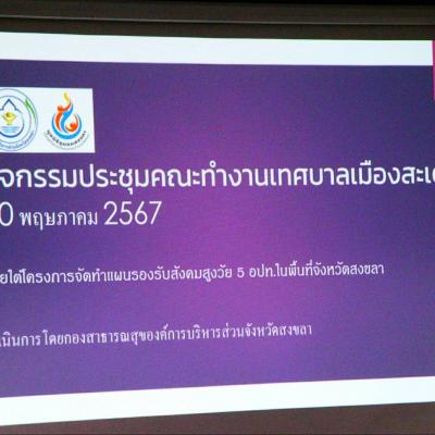 เวลา 09.00 น. นายเชิดเกียรติ เมธีลักษณ์ ที่ปรึกษานายกองค์การบริหารส่วนจังหวัดสงขลา เป็นประธานเปิด “การอบรมเชิงปฏิบัติการจัดทำร่างแผนสุขภาวะและธรรมนูญชุมชนรองรับสังคมสูงวัย”(กิจกรรมย่อยที่ 2) ภายใต้ โครงการอบรมเพื่อสร้างเสริมสุขภาพอนามัยของประชาชนแบบบูรณาการ ปีงบประมาณ 2567 (กิจกรรมเครือข่าย อปท.รองรับสังคมสูงวัย) โดยมี นายนพดล ชุติมารัต รองนายกเทศมนตรีเมืองสะเดา นายอาคม นคราวงศ์ ที่ปรึกษานายกเทศมนตรีเมืองสะเดา และ นางสมยา หวังจิ ผู้อำนวยการกองสาธารณสุขและสิ่งแวดล้อม เทศบาลเมืองสะเดา ให้การต้อนรับ การจัดกิจกรรมดังกล่าวฯ มีวัตถุประสงค์เพื่ออบรมเกี่ยวกับแนวทางการจัดทำแผนรองรับสังคมสูงวัยระดับชุมชน เพื่อเป็นคณะทำงานดำเนินการใช้ระบบกลุ่มปิด imed@home ในการคัดกรองสุขภาพของประชาชนและนำข้อมูลมาคัดกรองสุขภาพมาวิเคราะห์ใช้ในการจัดทำแผนสุขภาวะและธรรมชุมชน ร่วมด้วย น.ส.รุจิรา ไชยเจริญ นักวิชาการสาธารณสุขปฏิบัติการ กองสาธารณสุข อบจ.สงขลา (ผู้ดำเนินการจัดโครงการ) ผู้นำชุมชนเขตพื้นที่อำเภอสะเดา อาสาสมัครสาธารณสุข ประชาชนจิตอาสา และเจ้าหน้าที่ที่เกี่ยวข้องร่วมการประชุม โดยมี นายชาคริต โภชะเรือง ประธานมูลนิธิชุมชนสงขลา เป็นวิทยากรให้ความรู้เกี่ยวกับระบบ imed@home