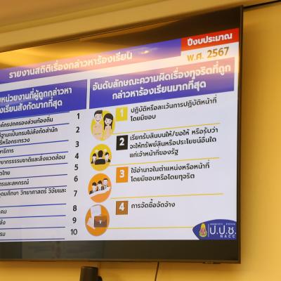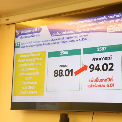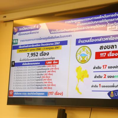. จากนั้น เป็นการติดตามสถานการณ์การทุจริตในจังหวัดสงขลาและแนวทางการดำเนินงานป้องกันและปราบปรามการทุจริตของสำนักงาน ป.ป.ช.ประจำจังหวัดสงขลา โดยสถิติเรื่องกล่าวหาร้องเรียนตั้งแต่วันที่ 1 ตุลาคม 2566 ถึง 3 กรกฎาคม 2567 มีการร้องเรียนมากถึง 117 เรื่อง มากเป็นลำดับที่ 1 ของเขตพื้นที่ภาค 9 ลำดับที่ 2 ของภาคใต้ และลำดับที่ 17 ของประเทศ โดยจำนวนของคำกล่าวหาพบว่าหน่วยงานองค์กรปกครองส่วนท้องถิ่น เป็นหน่วยงานที่ถูกร้องสังกัดมากที่สุด
