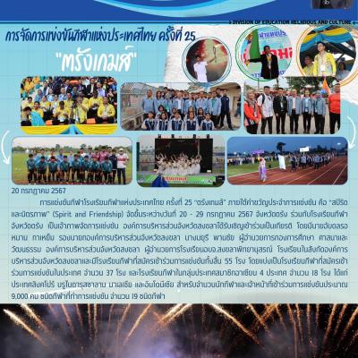 การแข่งขันกีฬาโรงเรียนกีฬาแห่งประเทศไทย ครั้งที่ 25 “ตรังเกมส์” ภายใต้คำขวัญประจำการแข่งขัน คือ “สปิริตและมิตรภาพ” (Spirit and Friendship) จัดขึ้นระหว่างวันที่ 20 - 29 กรกฎาคม 2567 จังหวัดตรัง ร่วมกับโรงเรียนกีฬาจังหวัดตรัง เป็นเจ้าภาพจัดการแข่งขัน องค์การบริหารส่วนจังหวัดสงขลาได้รับเชิญเข้าร่วมเป็นเกียรติ โดยมีนายอับดลรอหมาน กาเหย็ม รองนายกองค์การบริหารส่วนจังหวัดสงขลา นางมยุรี พานชัย ผู้อำนวยการกองการศึกษา ศาสนาและวัฒนธรรม องค์การบริหารส่วนจังหวัดสงขลา ผู้อำนวยการโรงเรียนอบจ.สงขลาพิทยานุสรณ์ โรงเรียนในสังกัดองค์การบริหารส่วนจังหวัดสงขลาและมีโรงเรียนกีฬาที่สมัครเข้าร่วมการแข่งขันทั้งสิ้น 55 โรง โดยแบ่งเป็นโรงเรียนกีฬาที่สมัครเข้าร่วมการแข่งขันในประเทศ จำนวน 37 โรง และโรงเรียนกีฬาในกลุ่มประเทศสมาชิกอาเซียน 4 ประเทศ จำนวน 18 โรง ได้แก่ ประเทศสิงคโปร์ บรูไนดารุสซาลาม มาเลเซีย และอินโดนีเซีย สำหรับจำนวนนักกีฬาและเจ้าหน้าที่เข้าร่วมการแข่งขันประมาณ 9,000 คน ชนิดกีฬาที่ทำการแข่งขัน จำนวน 19 ชนิดกีฬา