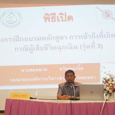 วันพุธที่ 7 พฤศจิกายน พ.ศ. 2561 นายสมหมาย ขวัญทองยิ้ม รองนายกองค์การบริหารส่วนจังหวัดสงขลา เป็นประธานเปิดโครงการอบรมเชิงปฏิบัติการ หลักสูตร การเข้าถึงที่เกิดเหตุกรณีเสียชีวิตฉุกเฉิน (รุ่นที่ 3) ณ ห้องประชุมอาคารศรีเกียรติพัฒน์ องค์การบริหารส่วนจังหวัดสงขลา