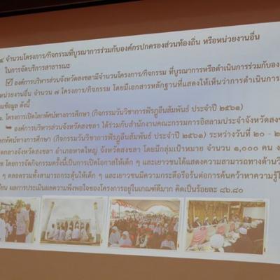 วันพฤหัสบดีที่ 15 พฤศจิกายน พ.ศ. 2561 นายอัฐชัย พรหมมณี รองปลัดองค์การบริหารส่วนจังหวัดสงขลา นำคณะผู้บริหาร ข้าราชการและลูกจ้างองค์การบริหารส่วนจังหวัด เข้ารับการประเมินประสิทธิภาพและประสิทธิผลการปฏิบัติราชการขององค์การบริหารส่วนจังหวัดสงขลา
