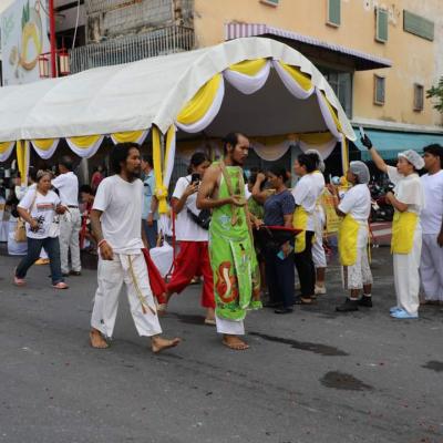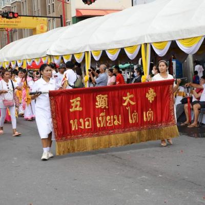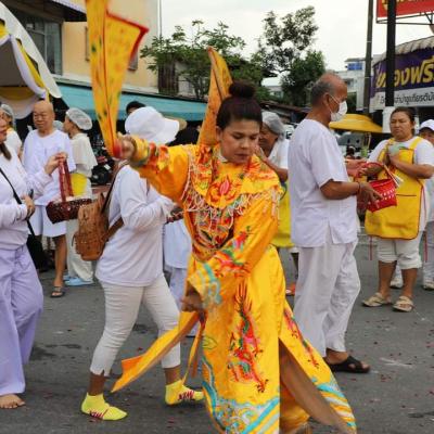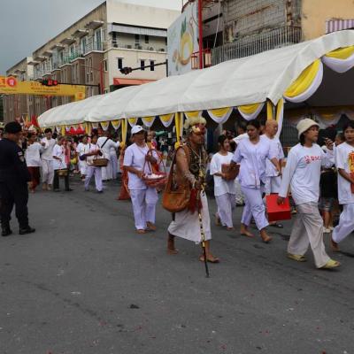 โดยบรรยากาศขบวนแห่พระมีเหล่าม้าทรงและเทพเจ้าจีน ทั้งชายและหญิงจากศาลเจ้าต่าง ๆ ในจังหวัดสงขลา แสดงอิทธิฤทธิ์ด้วยการทรมานร่างกาย ใช้อุปกรณ์มีคมนานาชนิดและหลากหลายรูปแบบทิ่มแทงไปตามอวัยวะต่าง ๆ ของร่างกาย โดยมีความเชื่อว่าเป็นการรับเคราะห์แทนผู้ถือศีลกินผักตามความเชื่อมาแต่โบราณ และการแสดงเชิดสิงโต-มังกร เข้าร่วมขบวนแห่จากศาลเจ้าออกเดินไปตามถนนย่านการค้าการท่องเที่ยวของเมืองหาดใหญ่ ตั้งแต่ถนนนิพัทธ์อุทิศ 3 , ถนนมนัสฤดี , ถนนนิพัทธ์อุทิศ 2 , 1 ถนนธรรมนูญวิถี ,ถนนแสงจันทร์ , ถนนประชาธิปัตย์ และวนกลับไปยังถนนศุภสารรังสรรค์ (สถานที่จัดงาน) ซึ่งตลอดเส้นทางมีการตั้งเครื่องเซ่นไหว้ไว้ให้เหล่าม้าทรงและเทพเจ้า เพื่อความเป็นสิริมงคล