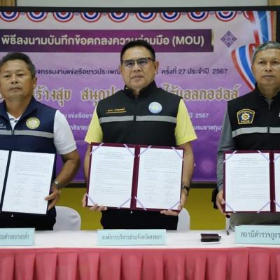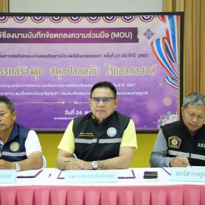 วันนี้ (24 ต.ค. 67) ที่ศาลาประชาคมอำเภอบางกล่ำ อำเภอบางกล่ำ จังหวัดสงขลา นายไพเจน มากสุวรรณ์ นายกองค์การบริหารส่วนจังหวัดสงขลา เป็นประธานกล่าวเปิดพิธีลงนามบันทึกข้อตกลง (MOU) การจัดงานการแข่งขันกีฬาเรือยาวประเพณีจังหวัดสงขลา ครั้งที่ 27 ประจำปี 2567 "วัฒนธรรมสร้างสุข สนุกปลอดภัย ไร้แอลกอฮอล์" ชิงถ้วยพระราชทาน สมเด็จพระกนิษฐาธิราชเจ้า กรมสมเด็จพระเทพรัตนราชสุดาฯ สยามบรมราชกุมารี กำหนดจัดงานในวันที่ 2-3 พฤศจิกายน 2567 ณ ท่าน้ำวัดบางหยี ตำบลบางกล่ำ อำเภอบางกล่ำ จังหวัดสงขลา โดยมี นายสมโภช นันทวงศ์ รองนายกองค์การบริหารส่วนตำบลบางกล่ำ , พันตำรวจโท ขจรศักดิ์ ชูโตชนะ สารวัตรป้องกันปรามปราม สถานีตำรวจภูธรบางกล่ำ , นายเวียง จันทฤทธิ์ นายกเทศมนตรีตำบลบางเหรียง , นางวรรณา ไกรดิษฐ์ ปลัดอำเภอเจ้าพนักงานปกครองชำนาญการพิเศษ รักษาราชการแทนนายอำเภอบางกล่ำ , นายณัฐวัฒน์ กิตติธนาชูพันธ์ ผู้จัดการเครือข่ายงดเหล้า ภาคใต้ตอนล่าง , นายเที่ยงธรรม อินแก้ว สาธารณสุขอำเภอบางกล่ำ และ ดร.ณัจยา แก้วนุ้ย ผู้จัดการโครงการขับเคลื่อนระบบอาหารตลอดห่วงโซ่อาหารในโรงเรียนและชุมชน ร่วมลงนาม พร้อมด้วย นายปรีชัย มาละวรรณโณ ที่ปรึกษานายกองค์การบริหารส่วนจังหวัดสงขลา , นางมยุรี พานชัย ผู้อำนวยการกองการศึกษา องค์การบริหารส่วนจังหวัดสงขลา , นายธีระวุฒิ เรืองศรี สมาชิกสภาองค์การบริหารส่วนจังหวัดสงขลา เขตอำเภอบางกล่ำ , นายศดิศ ไชยศิริสมาชิกสภาองค์การบริหารส่วนจังหวัดสงขลา เขตอำเภอควนเนียง และแขกผู้มีเกียรติเข้าร่วม