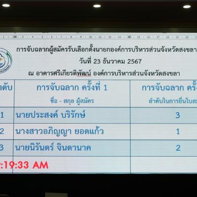 โดยขั้นตอนการสมัครฯ ผู้อำนวยการการเลือกตั้งฯ ให้ 3 ว่าที่ผู้สมัครฯ จับสลากเพื่อจัดลำดับผู้เข้าสมัครรับเลือกตั้งนายกองค์การบริหารส่วนจังหวัดสงขลา ซึ่งปรากฎว่า นางสาวอภิญญา ยอดแก้ว ผู้สมัครอิสระ จับได้หมายเลข 1 , นายนิรันดร์ จินดานาค พรรคประชาชน จับได้หมายเลข 2 และนายประสงค์ บริรักษ์ ทีมสงขลาเข้มแข็ง จับได้หมายเลข 3 อย่างไรก็ตาม การเปิดรับสมัครรับเลือกตั้งสมาชิกสภาองค์การบริหารส่วนจังหวัดสงขลา และนายกองค์การบริหารส่วนจังหวัดสงขลา จะมีขึ้นในระหว่างวันที่ 23-27 ธันวาคม 2567 ณ ห้องประชุมศรีเกียรติพัฒน์ องค์การบริหารส่วนจังหวัดสงขลา ตำบลพะวง อำเภอเมืองสงขลา จังหวัดสงขลา ก่อนจะมีการออกมาใช้สิทธิ์ออกเสียงตั้งในวันเสาร์ที่ 1 กุมภาพันธ์ 2568 ระหว่างเวลา 08.00-17.00 น.