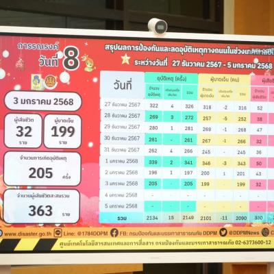 ทั้งนี้ ในที่ประชุมได้ร่วมรับฟังการรายงานผลการป้องกันและลดอุบัติเหตุทางถนนช่วงเทศกาลปีใหม่ พ.ศ.2568 ประจำวันอาทิตย์ที่ 5 มกราคม 2568 โดย สำนักงานป้องกันและบรรเทาสาธารณภัยจังหวัดสงขลา ซึ่งมีสถิติอุบัติเหตุทางถนนช่วงเทศกาลปีใหม่ พ.ศ.2568 จังหวัดสงขลา ช่วงควบคุมเข้มข้น 10 วัน ระหว่างวันที่ 27 ธันวาคม 2567 - 5 มกราคม 2568 เกิดอุบัติเหตุ 56 ครั้ง บาดเจ็บ 52 คน เสียชีวิต 10 คน และรับฟังข้อสั่งการผู้ว่าราชการจังหวัดสงขลา ตลอดจนผลการดำเนินงานของหน่วยงานต่าง ๆ ในช่วงการปฏิบัติงานอีกด้วย นอกจากนี้ ในช่วงท้ายของการประชุม นายวิทยา จันทน์เสนะ รองผู้ว่าราชการจังหวัดสงขลา ประธานการประชุม ได้เน้นย้ำหน่วยงานที่เกี่ยวข้องรวบรวมข้อมูลของการรณรงค์ฯ นำมาสรุปเพื่อถอดบทเรีย เตรียมพร้อมมาตรการป้องกันอุบัติเหตุบนท้องถนนช่วงเทศกาลสงกรานต์ 2568 ของจังหวัดสงขลา ต่อไป