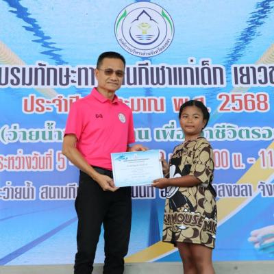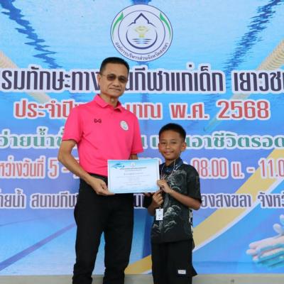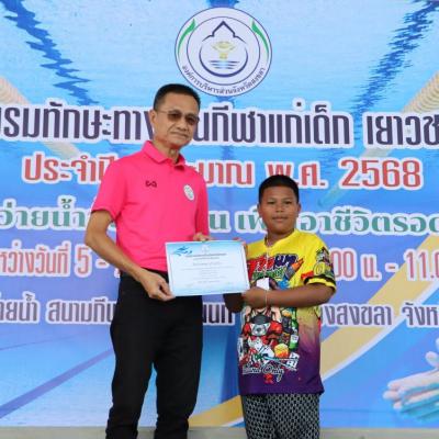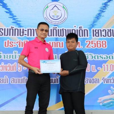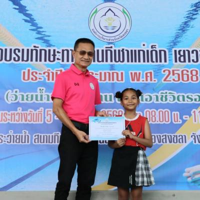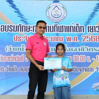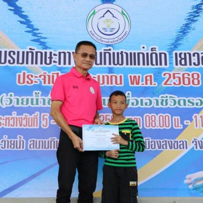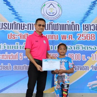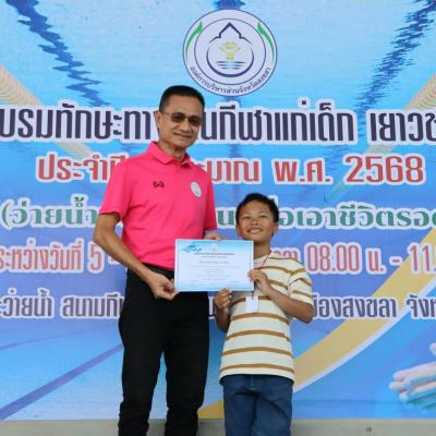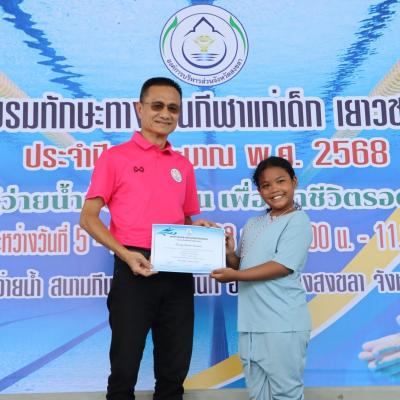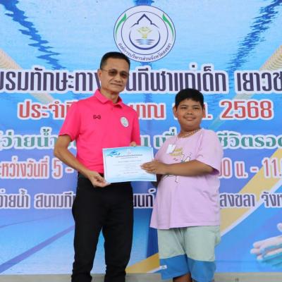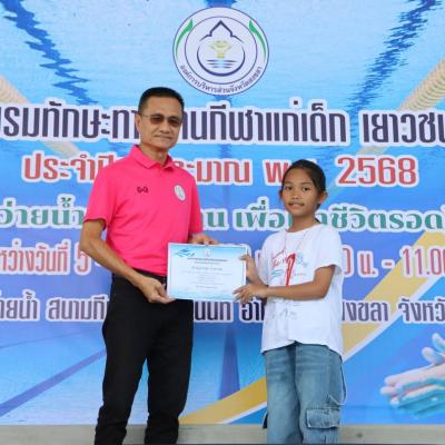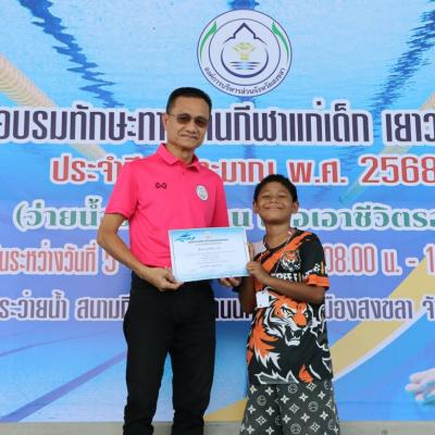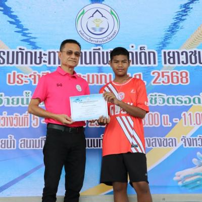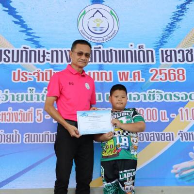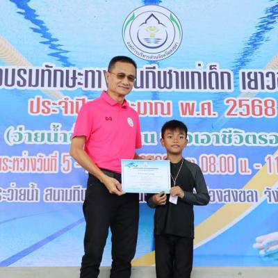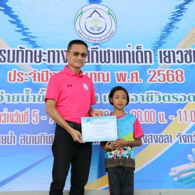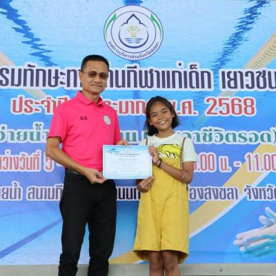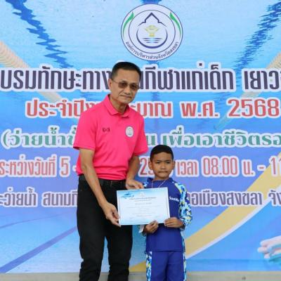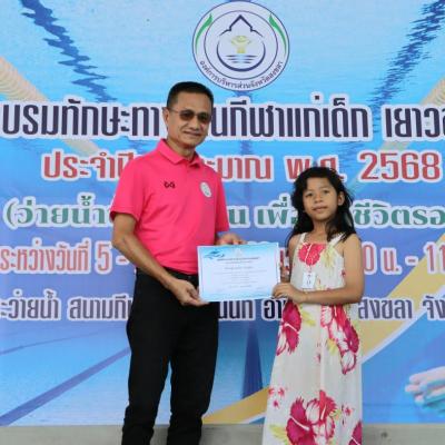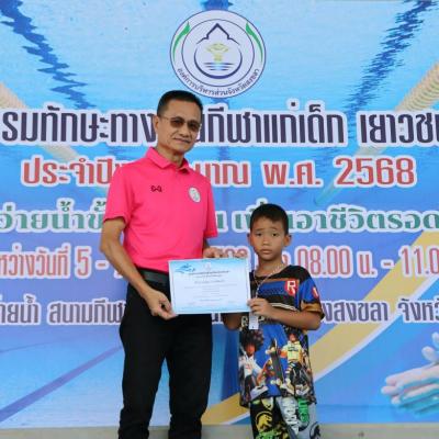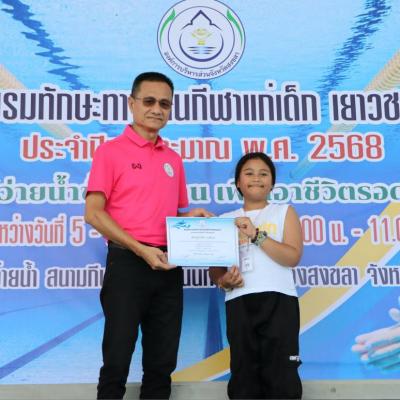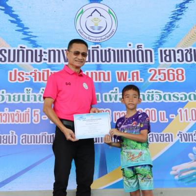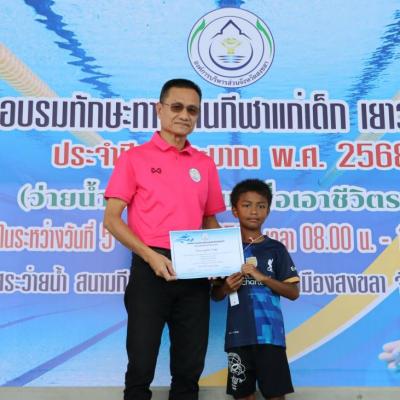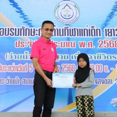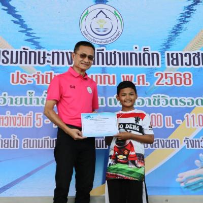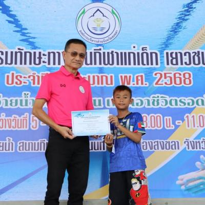 พิธีปิดพร้อมมอบใบประกาศเกียรติบัตรแก่ผู้เข้ารับการฝึกอบรมทักษะทางด้านกีฬาแก่เด็ก เยาวชน และประชาชน ประจำปีงบประมาณ พุทธศักราช 2568 (ว่ายน้ำขั้นพื้นฐาน เพื่อเอาชีวิตรอด)