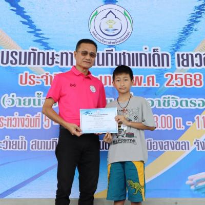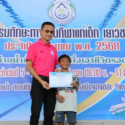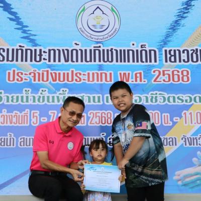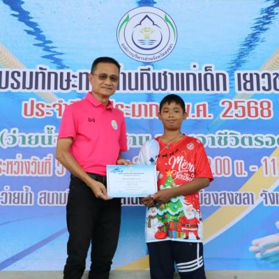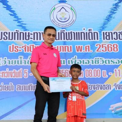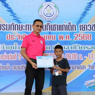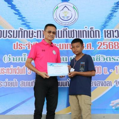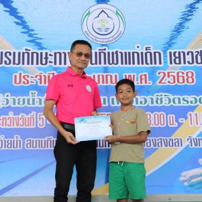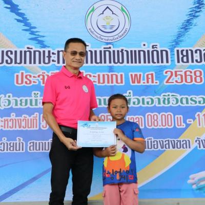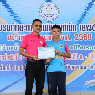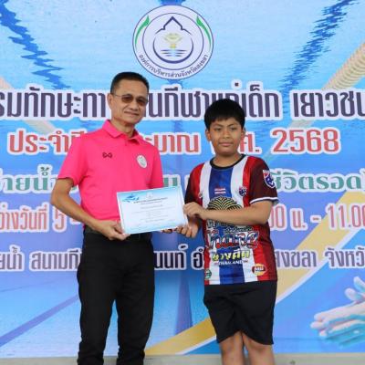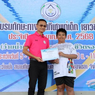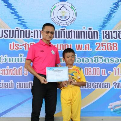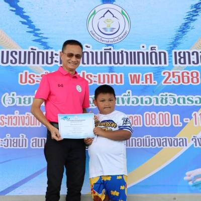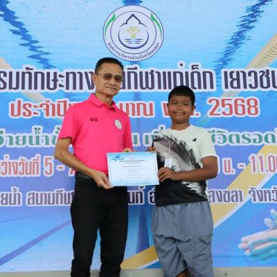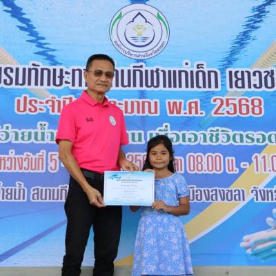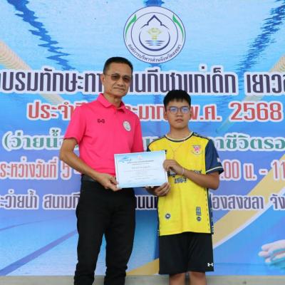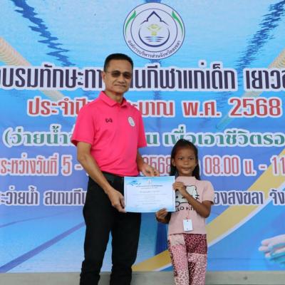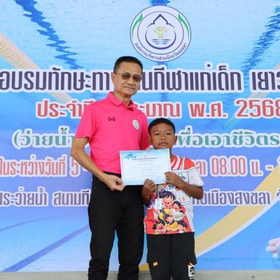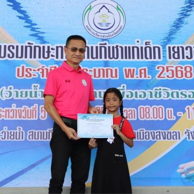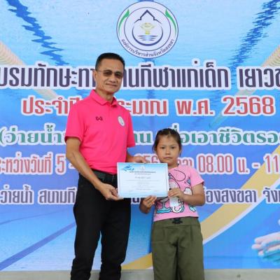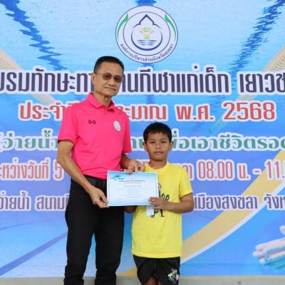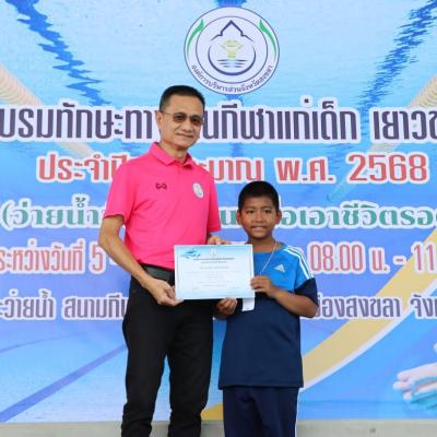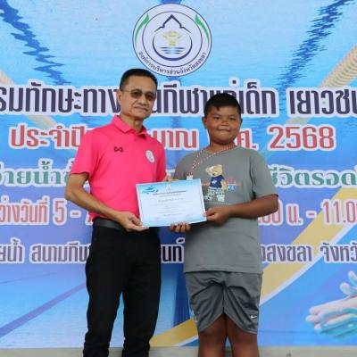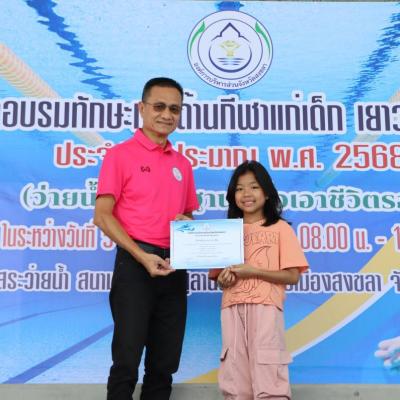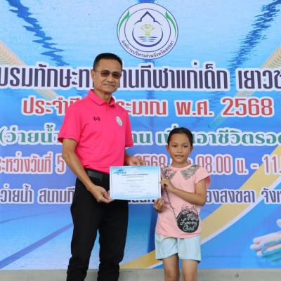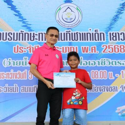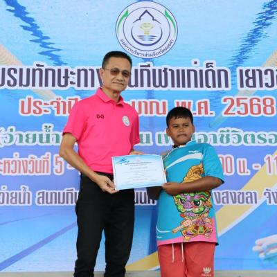 พิธีปิดพร้อมมอบใบประกาศเกียรติบัตรแก่ผู้เข้ารับการฝึกอบรมทักษะทางด้านกีฬาแก่เด็ก เยาวชน และประชาชน ประจำปีงบประมาณ พุทธศักราช 2568 (ว่ายน้ำขั้นพื้นฐาน เพื่อเอาชีวิตรอด)