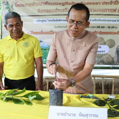 นายอำนวย พิณสุวรรณ กล่าวว่า ในวันนี้ ถือเป็นกิจกรรมที่สำคัญอีกงานหนึ่งของ อบจ.สงขลา ที่ได้จัดตั้งกองส่งเสริมการเกษตร ขึ้นมาเป็นผู้รับผิดชอบหลักในภารกิจที่เกี่ยวกับด้านการเกษตร ทั้ง พืช สัตว์ ประมง และอื่น ๆ ที่เกี่ยวข้องกัน สำหรับการฝึกอบรมในวันนี้ เป็นการเติมเต็ม เพิ่มองค์ความรู้และทักษะให้เกษตรกร กลุ่มเกษตรกรและประชาชนผู้ที่สนใจใน "เทคโนโลยีการผลิตกาแฟโรบัสต้า และผลิตภัณฑ์จากกาแฟ จังหวัดสงขลา" ด้านการขยายพันธุ์กาแฟสายพันธุ์โรบัสต้า (การเสียบยอด) และการทำผ้ามัดย้อมจากกาแฟ ซึ่งได้รับเกียรติจากวิทยากรที่มีประสบการณ์จากหลายภาคส่วน ซึ่งจะช่วยเพิ่มพูนองค์ความรู้ และประสบการณ์ต่าง ๆ ที่เป็นประโยชน์ในการนำมาพัฒนาความรู้ของตนเองให้ดียิ่งขึ้น และนำไปถ่ายทอดองค์ความรู้ต่าง ๆ ต่อไปกับพี่น้องเกษตรกรด้วยกัน