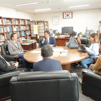 และดร.จเร สุวรรณชาต ผู้แทนจากคณะสถาปัตยกรรมศาสตร์มหาวิทยาลัยเทคโนโลยีราชมงคลศรีวิชัยและมหาวิทยาลัยเชียงใหม่ ในฐานะที่ปรึกษาโครงการฯ เข้าพบคุณฮัน ด๊อก ซู ประธานกรรมการเมืองสร้างสรรค์ขององค์การยูเนสโก เพื่อแลกเปลี่ยนเรียนรู้เกี่ยวกับการขับเคลื่อนเครือข่ายเมืองสร้างสรรค์ขององค์การ UNESCO ในด้านอาหาร และร่วมหารือประเด็นเกี่ยวกับการเป็นเครือข่ายเมืองสร้างสรรค์ รวมถึงการส่งเสริมความร่วมมือระหว่างเมืองในการขับเคลื่อนการพัฒนาในมิติต่าง ๆ