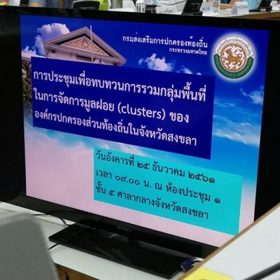 25 ธันวาคม 2561 นายนิพนธ์ บุญญามณี นายกองค์การบริหารส่วนจังหวัดสงขลา มอบหมายให้ นายสมหมาย ขวัญทองยิ้ม รองนายกองค์การบริหารส่วนจังหวัดสงขลา และนางสาวชัญญณัท ทองคณารักษ์ หัวหน้าฝ่ายวางผังพัฒนาเมือง เข้าร่วมประชุมเพื่อทบทวนการรวมกลุ่มพื้นที่ในการจัดการมูลฝอย (Cluster)ขององค์กรปกครองส่วนท้องถิ่นในจังหวัดสงขลา ณ ห้องประชุม 1 ศาลากลางจังหวัดสงขลา โดยมี นายศักระ กปิลกาญจน์ รองผู้ว่าราชการจังหวัดสงขลา เป็นประธานในการประชุม ที่ประชุมมีมติเห็นชอบการรวมกลุ่มตามรูปแบบกลุ่มcluster เดิมไปก่อนจนกว่าระบบกำจัดขยะของ อบจ.สงขลาจะเดินระบบ