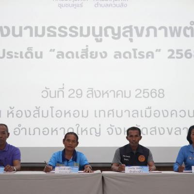 วันนี้ (29 ส.ค. 68) นางสาวปรินดา ปาลาเร่ รองนายกองค์การบริหารส่วนจังหวัดสงขลา เป็นประธานกล่าวเปิดในพิธีลงนามธรรมนูญสุขภาพตำบลควนลังและตำบลหูแร่ โดยมี นายอภิชัย เกื้อก่อบุญ รองปลัดองค์การบริหารส่วนจังหวัดสงขลา รักษาราชการแทน ผู้อำนวยการกองสาธารณสุข กล่าวรายงาน พร้อมด้วย นายสมชีพ จันทะคาร รองนายกเทศมนตรีเมืองควนลัง นายเศรษฐการ เพชรวารี ปลัดอำเภอหาดใหญ่ ตลอดจนผู้แทนหน่วยงานที่เกี่ยวข้อง และภาคีเครือข่ายเข้าร่วม ณ ห้องประชุมส้มโอหอมควนลัง ชั้น 5 เทศบาลเมืองควนลัง ตำบลควนลัง อำเภอหาดใหญ่ จังหวัดสงขลา