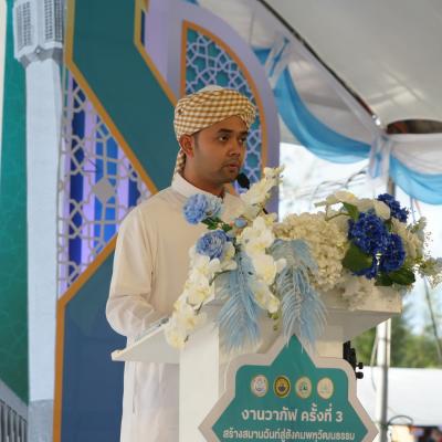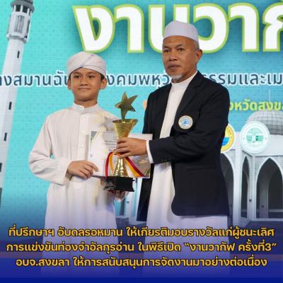 ที่ปรึกษาฯ อับดลรอหมาน ให้เกียรติมอบรางวัลแก่ผู้ชนะเลิศการแข่งขันท่องจำอัลกุรอ่าน ในพิธีเปิด “งานวากัฟ ครั้งที่3” อบจ.สงขลา ให้การสนับสนุนการจัดงานมาอย่างต่อเนื่อง