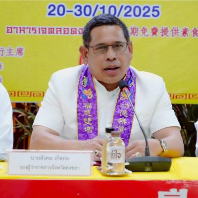 วันที่ 9 ตุลาคม 2568 เวลา 16.30 น. ณ มูลนิธิโรงเจเต๋าบ้อเก็ง หาดใหญ่ ตำบลคอหงส์ อำเภอหาดใหญ่ จังหวัดสงขลา นายสุรสิทธิ์ ศรีอินทร์ ที่ปรึกษานายองค์การบริหารส่วนจังหวัดสงขลา ร่วมงานแถลงข่าว "การจัดงานเทศกาลถือศีลกินเจ" ครั้งที่ 31 ประจำปี 2568 ระหว่างวันที่ 20-30 ตุลาคม 2568 พร้อมด้วย นายเอนก แช่ตั้ง ประธานมูลนิธิโรงเจเต๋าบ้อเก็ง หาดใหญ่ นายสราวุธ สิริวิวัฒนา ประธานจัดงานเทศกาลถือศีลกินเจ ครั้งที่ 31 นาย ทวีศักดิ์ ทวีรัตน์ นายกเทศมนตรีเมืองคอหงส์ และอาจารย์เกียรติศักดิ์ วิเศษดอนหวาย เจ้าสำนักมูลนิธิโรงเจเต๋าบ้อเก็ง หาดใหญ่ โดยมีนายสังคม เกิดก่อรองผู้ว่าราชการจังหวัดสงขลา เป็นประธานการแถลงข่าว พร้อมด้วย แขกผู้มีเกียรติและสื่อมวลชนเข้าร่วม