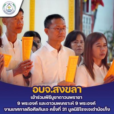 วันที่ 27 ตุลาคม 2568 นายสุรสิทธิ์ ศรีอินทร์ ที่ปรึกษานายกองค์การบริหารส่วนจังหวัดสงขลา เข้าร่วมพิธีบูชาดาวนพราชา 9 พระองค์ และดาวนพเคราะห์ 9 พระองค์ โดยมี นายเอนก แช่ตั้ง ประธานมูลนิธิโรงเจเต๋าบ้อเก็ง ให้การต้อนรับ นายเอก ยังอภัย ณ สงขลา นายอำเภอหาดใหญ่ ประธานในพิธี พร้อมด้วย คณะกรรมการมูลนิธิฯ นักท่องเที่ยวชาวไทยและต่างชาติตลอดจนพี่น้องชาวไทยเชื้อสายจีนในพื้นที่เข้าร่วม ณ มูลนิธิโรงเจเต๋าบ้อเก็ง หาดใหญ่ อำเภอหาดใหญ่ จังหวัดสงขลา ดำเนินพิธีโดย อาจารย์เกียรติศักดิ์ วิเศษดอนหวาย เจ้าสำนักมูลนิธิโรงเจเต๋าบ้อเก็ง หาดใหญ่